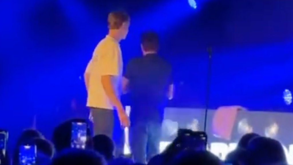 Niet veel later grijpt de beveiliging in. De jongen wordt snel van het podium gehaald en afgevoerd. Daarmee lijkt de situatie onder controle, maar het incident is op dat moment al vastgelegd en verspreidt zich razendsnel online.