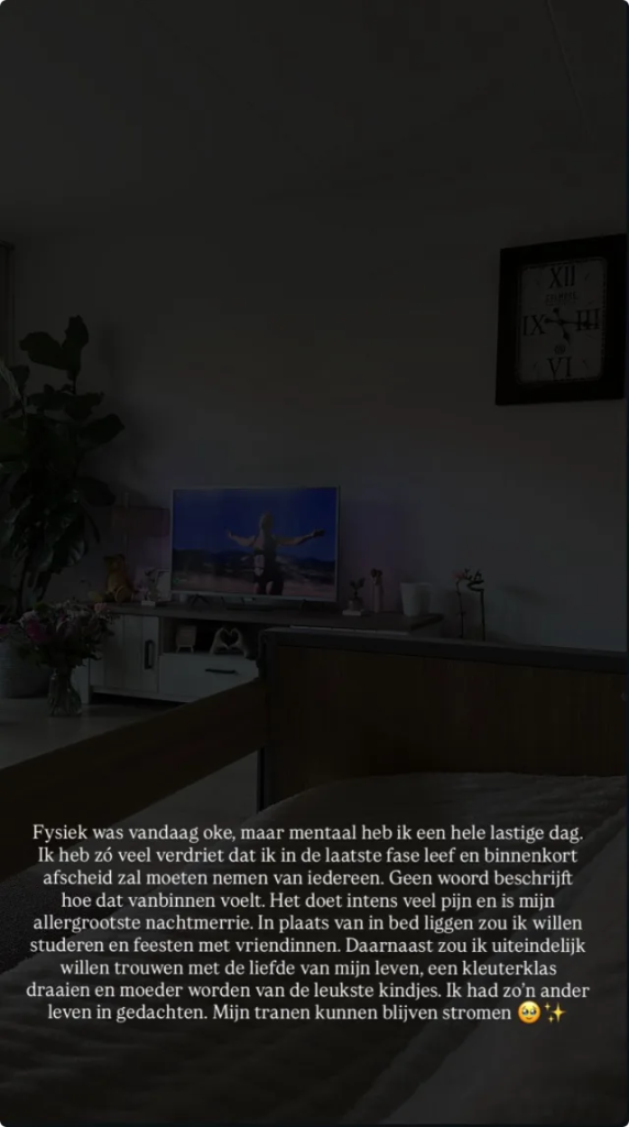 Jade vertelt dat het fysiek op dinsdag een redelijk goede dag was, maar dat vooral op mentaal vlak de realiteit hard binnenkomt. “Ik heb zó veel verdriet dat ik in de laatste fase leef en binnenkort afscheid moet nemen van iedereen. Geen enkel woord kan beschrijven hoe dat vanbinnen voelt. Het doet intens veel pijn en is mijn allergrootste nachtmerrie,” schrijft ze bij haar Instagram-verhaal.